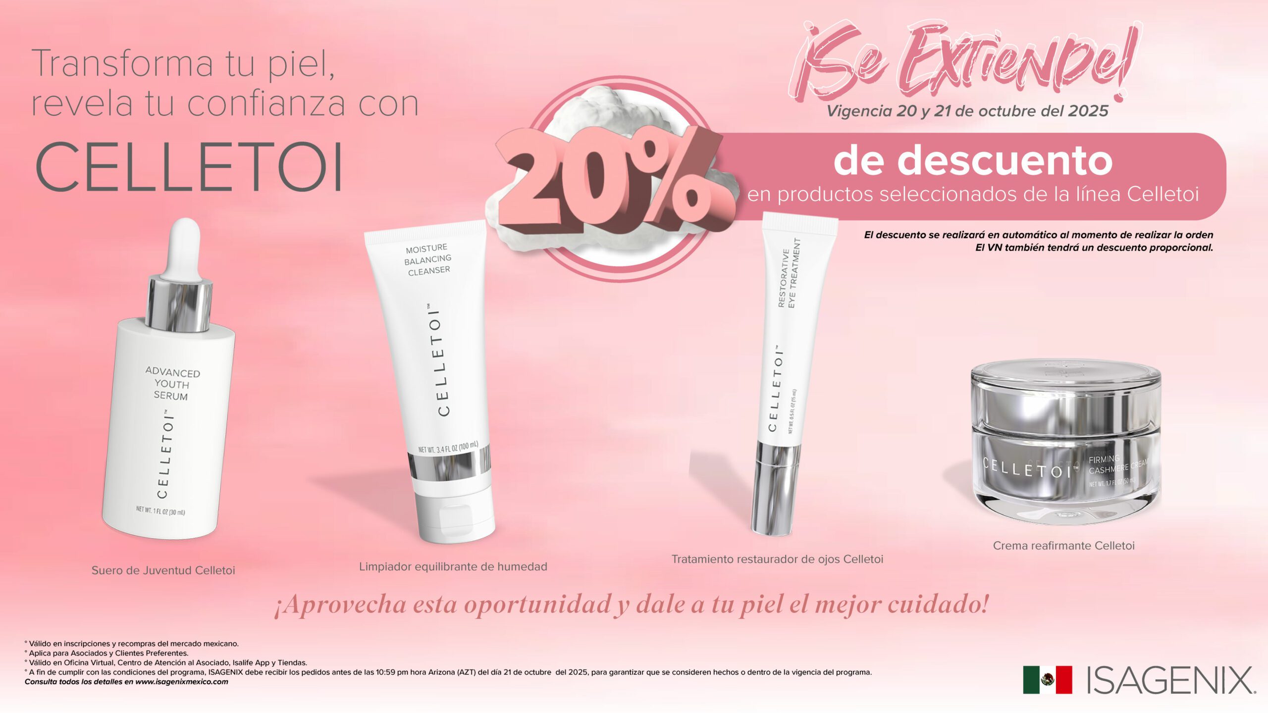 A fin de cumplir con las condiciones del programa, ISAGENIX debe recibir los pedidos antes de las 10:59 pm hora Arizona (AZT) del día 21 de octubre  del 2025, para garantizar que se consideren hechos o dentro de la vigencia del programa.
